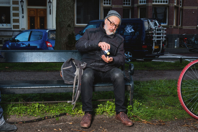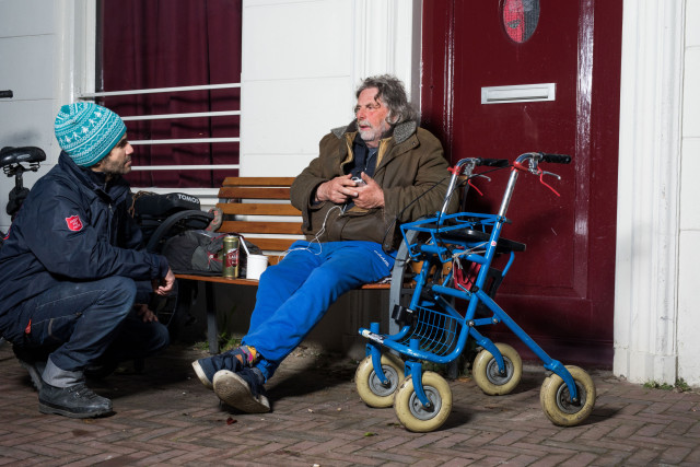 Robert zit op een bankje voor een huis. Als je niet beter zou weten, zou je denken dat hij voor zijn eigen huis zit. Niets is minder waar. Robert slaapt in een hostel, waar bijna zijn hele daklozenuitkering aan opgaat. Het is een bekende van de soepfiets. "Zo fantastisch dat jullie dit doen!" zegt Roberto. Hij is met zijn rollator naar dit bankje gelopen, want binnen in het hostel blijven wil hij niet. "Ik ben een buitenmens. Ik denk dat ik hier minder risico loop dan binnen, hoor. Ik kom geen mens tegen nu, op straat. Het verwaait zo wel, joh." Hij krijgt eieren, broodjes en twee bakjes warme soep. En hij praat Nourdin even bij over de problemen met zijn huisvesting. Robert komt uit Tilburg, en dus is het lastig om in Utrecht binnen te mogen slapen. "Niet dat ik echt in een opvang zou willen. Maar in Utrecht heb je tenminste geen slaapzalen." Nourdin knikt begrijpend. "Robert is precies zo iemand die gewoon een huis nodig heeft, en geen opvang. Voor mensen als hij moeten er gewoon woonplekken zijn."