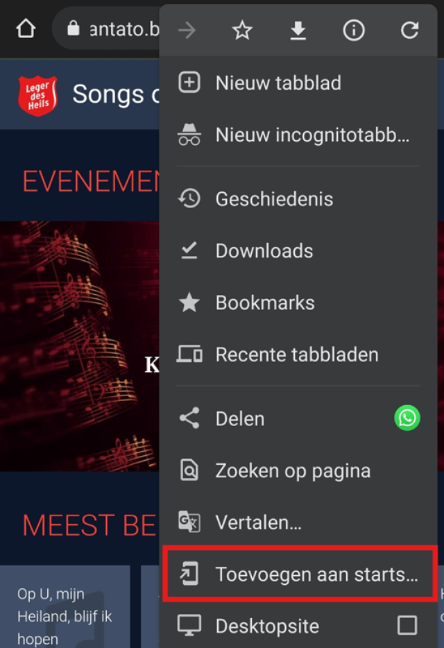 Kies op optie Toevoegen aan startscherm via de knop Meer opties rechtsboven: