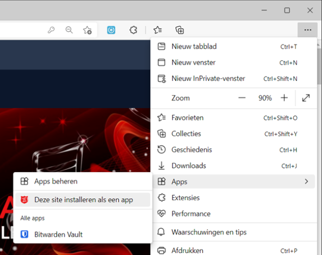 Kies de optieDeze site installeren als een apponderAppsin het menuInstellingen en meer (Alt+F):