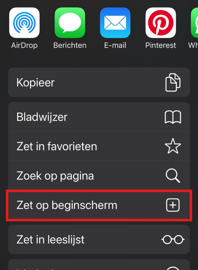 Gebruik de optie Zet op beginscherm onder de knop Delen: